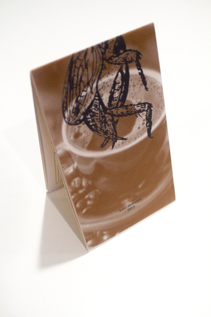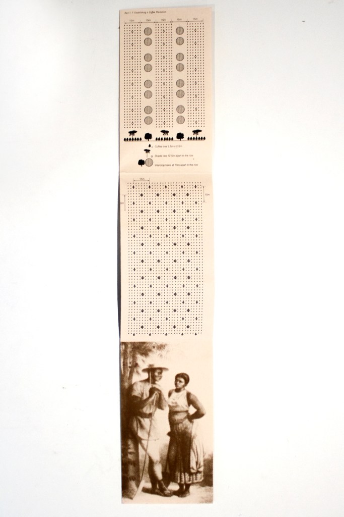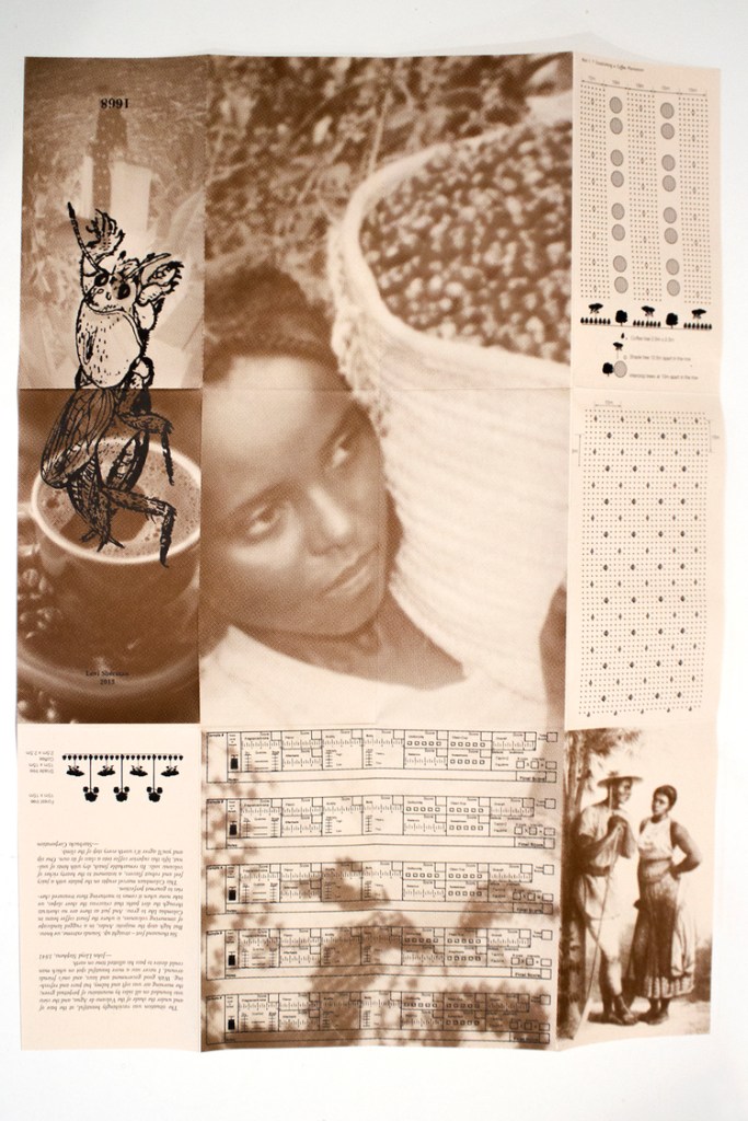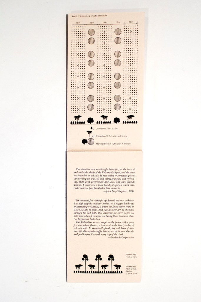 Elements from coffee technical manuals carry on the rigid organization that characterizes the interior composition. This aesthetic of opaque objectivity and control that once abstracted the institutionalized disgrace of slavery persists today to obfuscate the commodity chain by which coffee comes to the global north. The global aspect of this chain is further referenced by the piece’s structure, which is scaled and folded like a map.