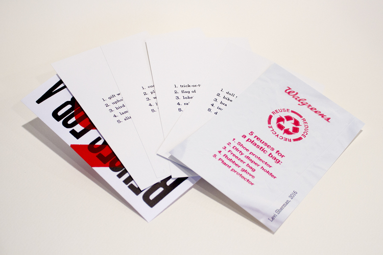 Walgreens went one step further and provided five suggestions for how to reuse their bags. Their strange little list reads like a work of flexographic poetry, and I decided to add a few ideas of my own. I pared an initial list of over fifty reuses down to twenty (four lists of five).