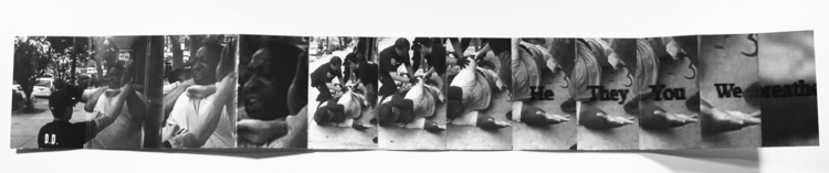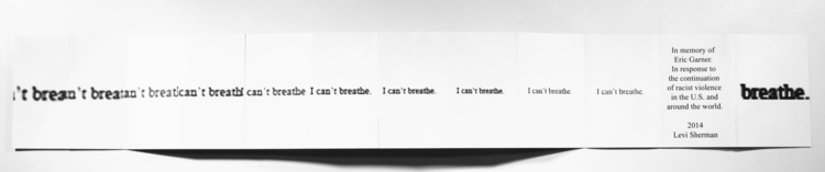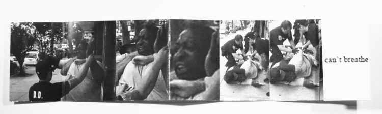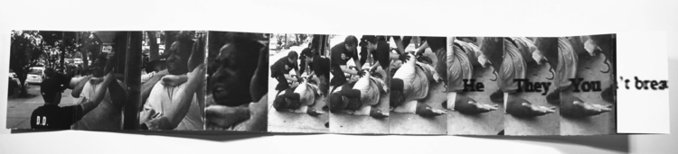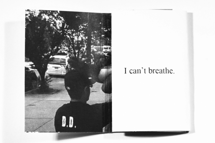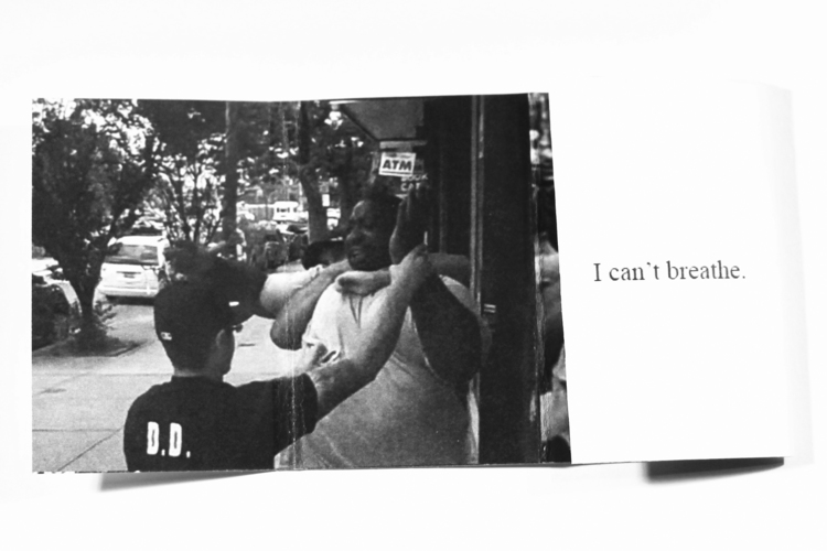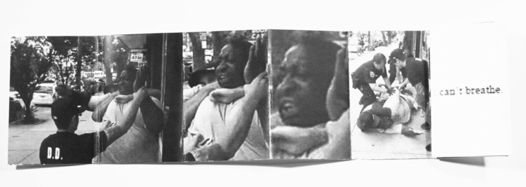 The book’s structure, which tumbles open eleven times, references the eleven utterances of the phrase “I cant breathe” by Garner, throughout the videotaped struggle that led to his killing. The repetition also speaks to the media coverage surrounding the event, including the replaying of the cell phone video footage from which the books images are taken.
