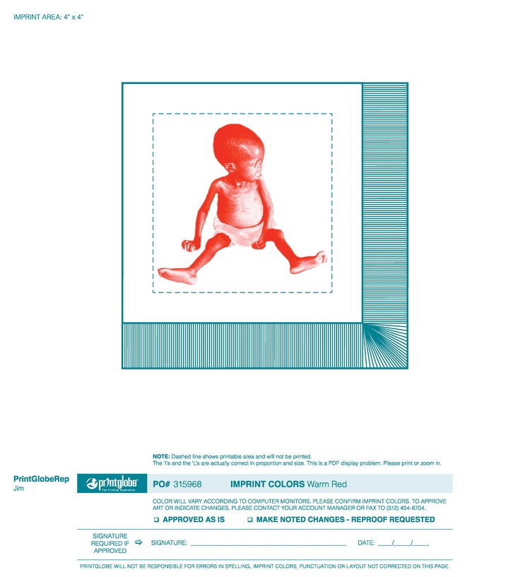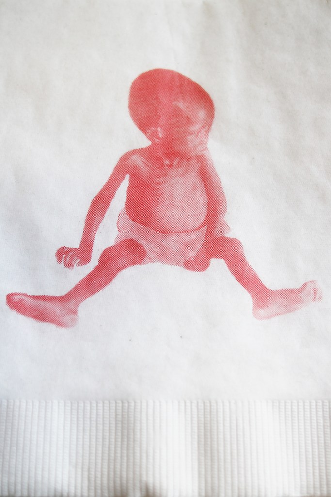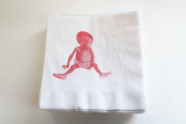 Disposable comprises a set of commercially printed paper banquet napkins. Where a corporate logo is usually printed, the napkins instead feature a photograph of a malnourished child. There is no text or other context provided; the viewer must draw connections from the sparse information they are provided, including the piece’s title. The napkin implies eating (furthermore, social and celebratory eating) and disposal, while the image represents starvation and suffering.