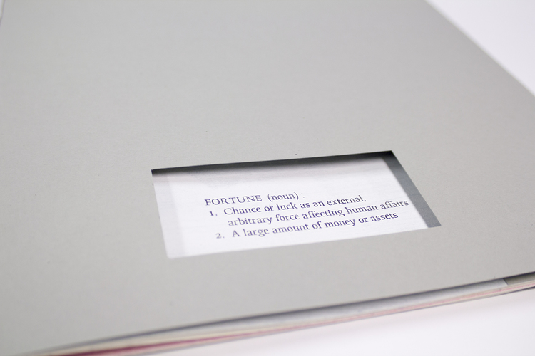 Fortune was developed through a series of chance operations and collaborative exercises. The book explores the notion of American exceptionalism, the American Dream, and the tension between merit and luck. The title, which reads like a dictionary definition, highlights the crux of this tension — the dual meaning of the word fortune. Fortune, meaning both chance and wealth is the perfect description of American life: privilege through the random act of having been born here. The randomly-generated These self-reflexive elements, especially relinquishing authorship, contribute to the critique rugged individualism and artistic genius.