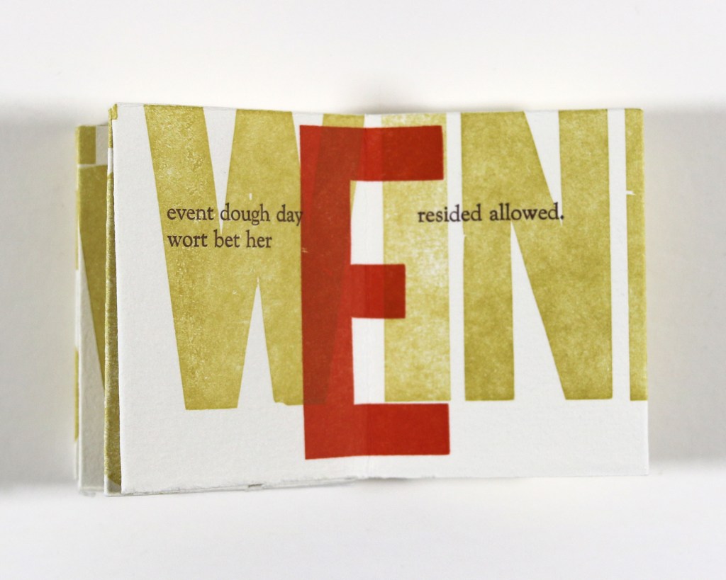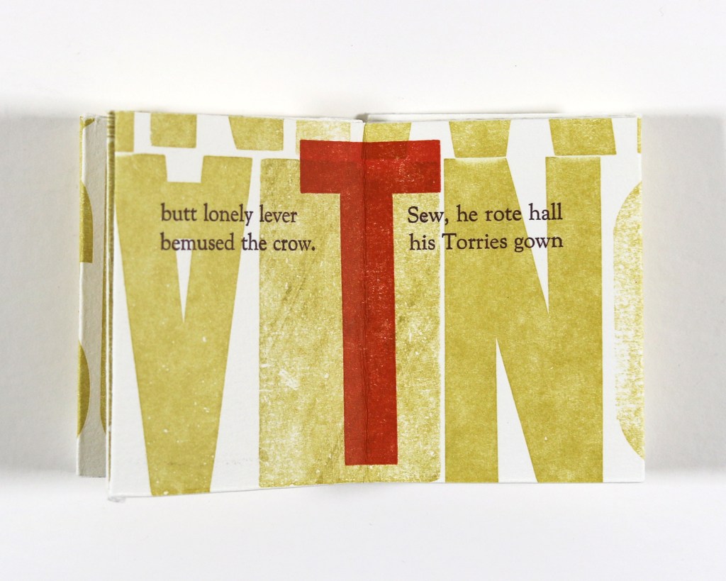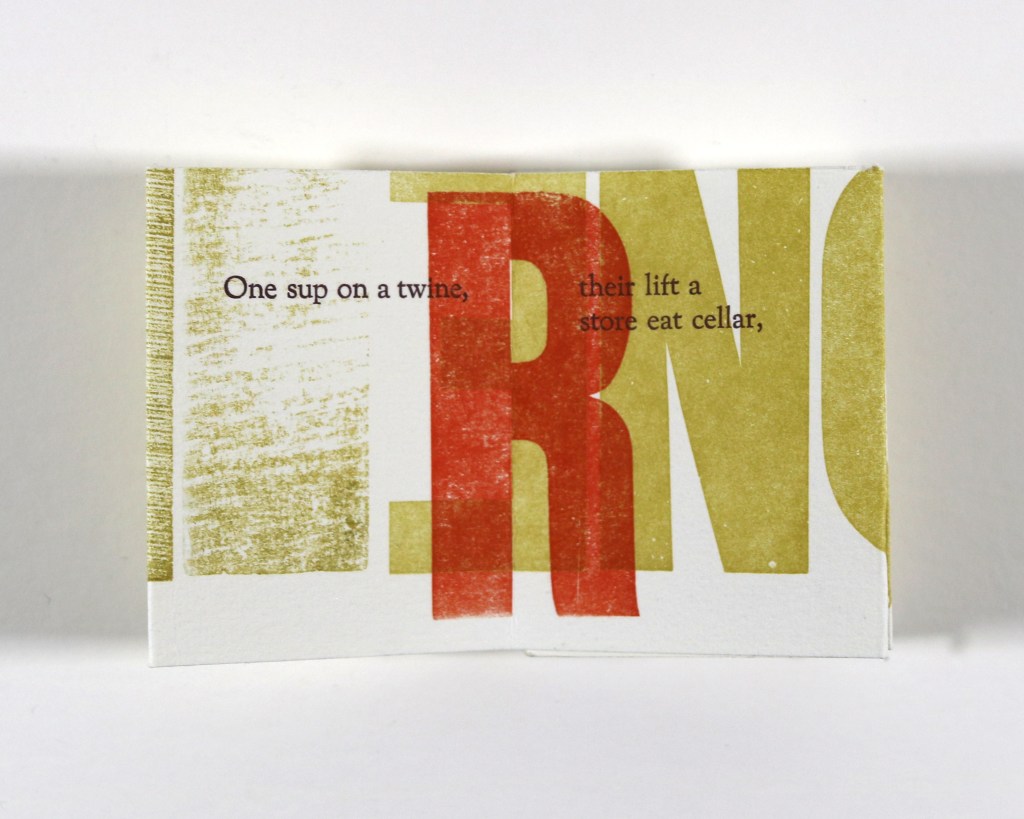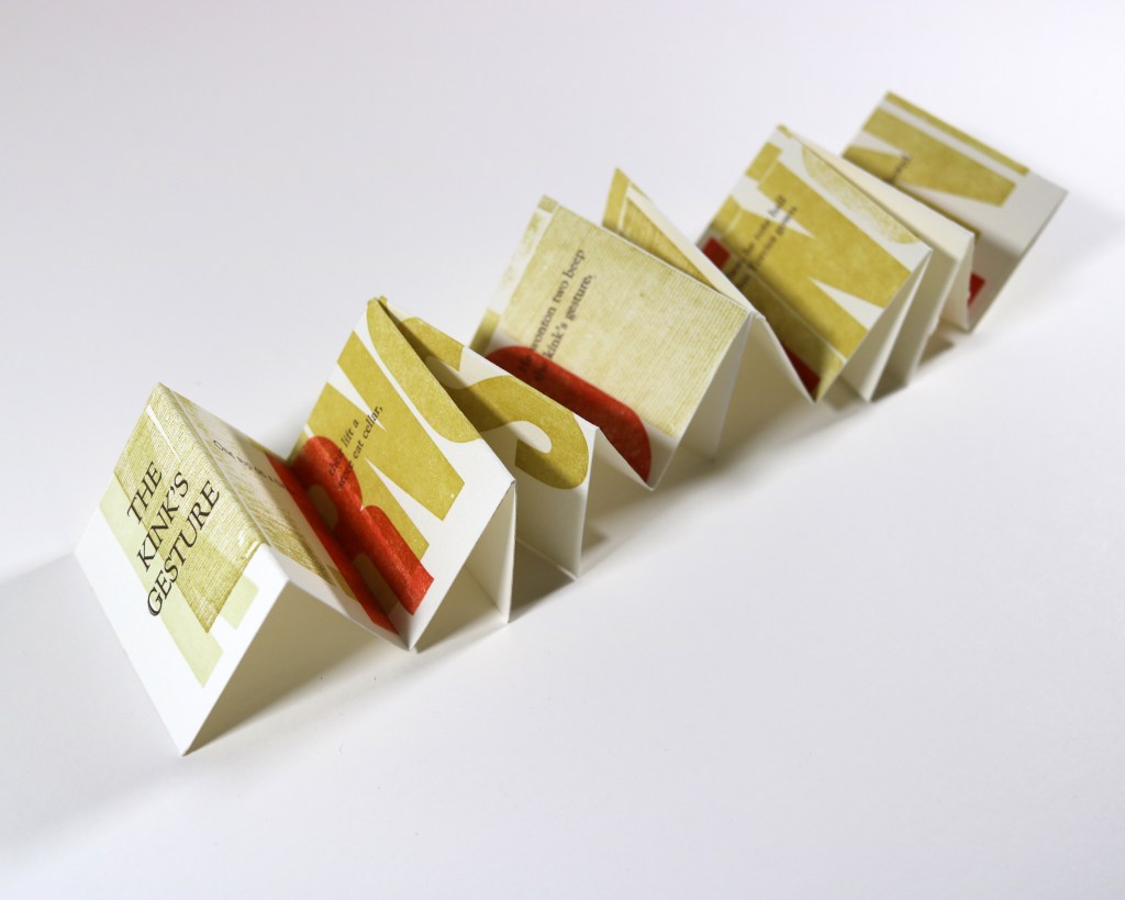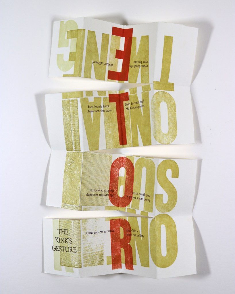 Written entirely in near-homophones, The Kink’s Gesture is a letterpress-printed parable about oral versus written transmission of stories.